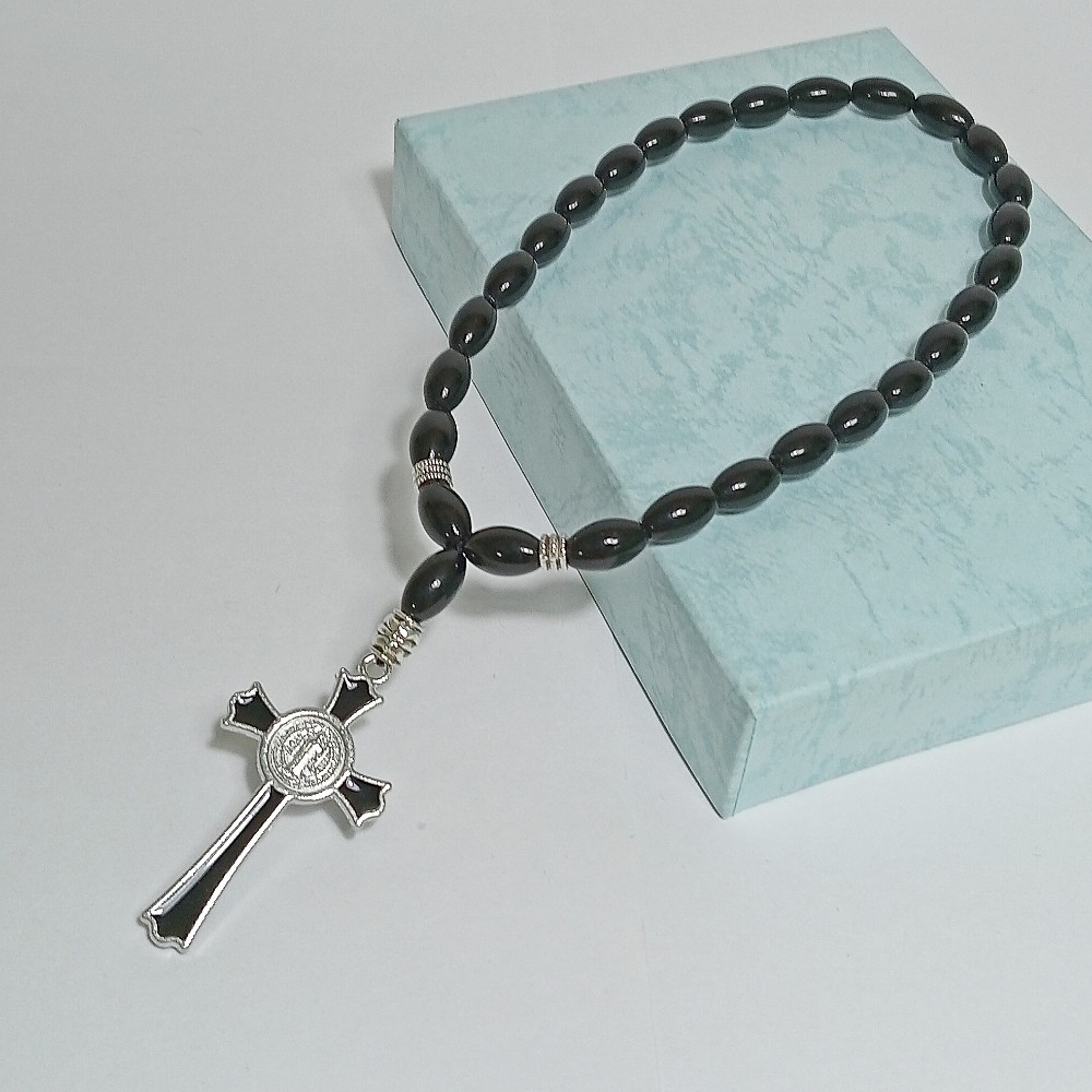 Размер бусин 8х12мм, изготовлены из матового стекла. Размер креста 5х8см.